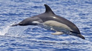This medium-sized dolphin has a very unique and unusual body coloration where the upper portion is colored black and the lower portion is white. What makes it unusual is that it has a specially-shaped pattern that looks like an hourglass which is colored light grey on one side of the hourglass and yellow gold on the other side. Common dolphins have 50 to 60 small but sharp teeth on each jaw making them the perfect predator of fish and squids.