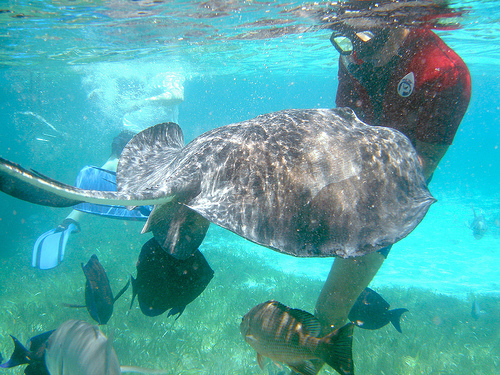 One of the rays’ family is the sting ray, famous for its particular ‘stinging’ property. It is common in tropical, subtropical waters, warm temperate oceans as well is in the Pacific along the coast of Costa Rica whereas some types are restricted to freshwater. Due to their extensive hunting, these once abundant rays have now been included in the list of vulnerable and endangered species by IUCN. Classified in the sub order Myliobatiformes, Sting rays are famous for one or more barbed stings they have on their tails. The stings of sting rays can reach up to the lengths of 35 cm and have two grooves called venom glands on the underside. This sting has an additional layer of skin, the intergumentary sheath covering it, and it is this skin which stores all the venom which is projected through the venom glands. The prospect of getting stung by this fascinating creature is what adds the scary element to all the interest the divers may have for it. But the sting is used by the sting ray solely for self-defense purpose.